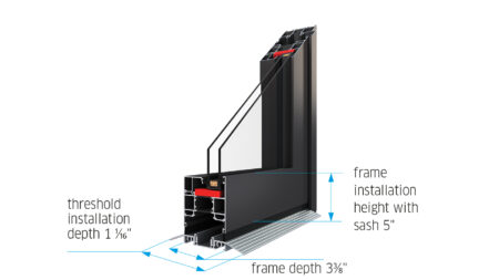 Frame depth of 3 ⅜” and a 5″ installation height with sash make this system compact and efficient. The 1 1⁄16″ threshold depth ensures ADA-compliant, easy transitions.